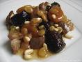 Dans une marmite metter le beurrre, laisser fondre, ajouter ensuite l'oignon et laisser revenir, ajouter ensuite le sucre, de l'eau et laisser cuire sur feu moyen, quand la viande est bien cuite et tendre, ajouter les pruneaux, le raisin sec et les pommes pelées et coupées en tranches, ajouter une tranche de citron et un peu de sucre si ce n'est pas assez sucré.